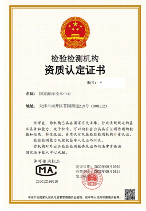 (6)2022年8月,通過了國家市場監(jiān)督管理總局的考核,成為我國首個(gè)具備波浪能和潮流能發(fā)電裝置功率特性和電能質(zhì)量特性檢驗(yàn)檢測認(rèn)證資質(zhì)的機(jī)構(gòu)(CMA)。