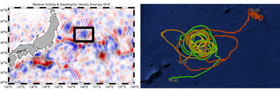 注:左圖中黑框內(nèi)為中尺度渦位置(根據(jù)2018年5月16日衛(wèi)星海表面異常數(shù)據(jù)反演的相對渦度和地轉(zhuǎn)流);右圖為浮標的漂移軌跡。
