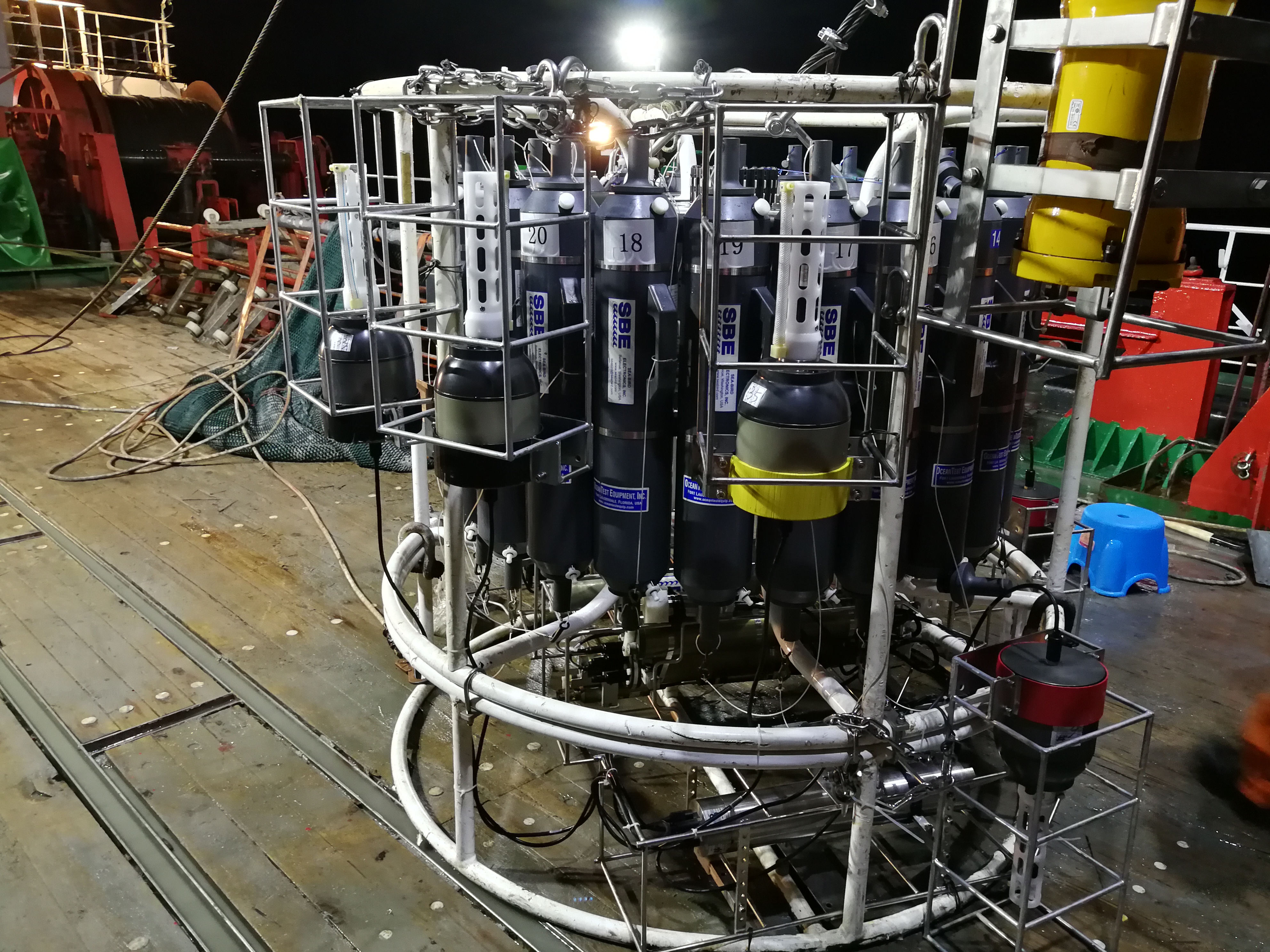本次海試測試儀器包括Argo 浮標用CTD 18臺,Glider 滑翔器用嵌入式CTD 3臺,Glider 滑翔器用一體式CTD 2臺,船載千米自容式CTD 4臺,國產(chǎn)CTD共計27臺,比測參考儀器三臺,海鳥SBE GP 1臺,海鳥19 PLUS CTD一臺,船方提供海鳥917 CTD一臺,共計30臺儀器參加本次中期海試工作。