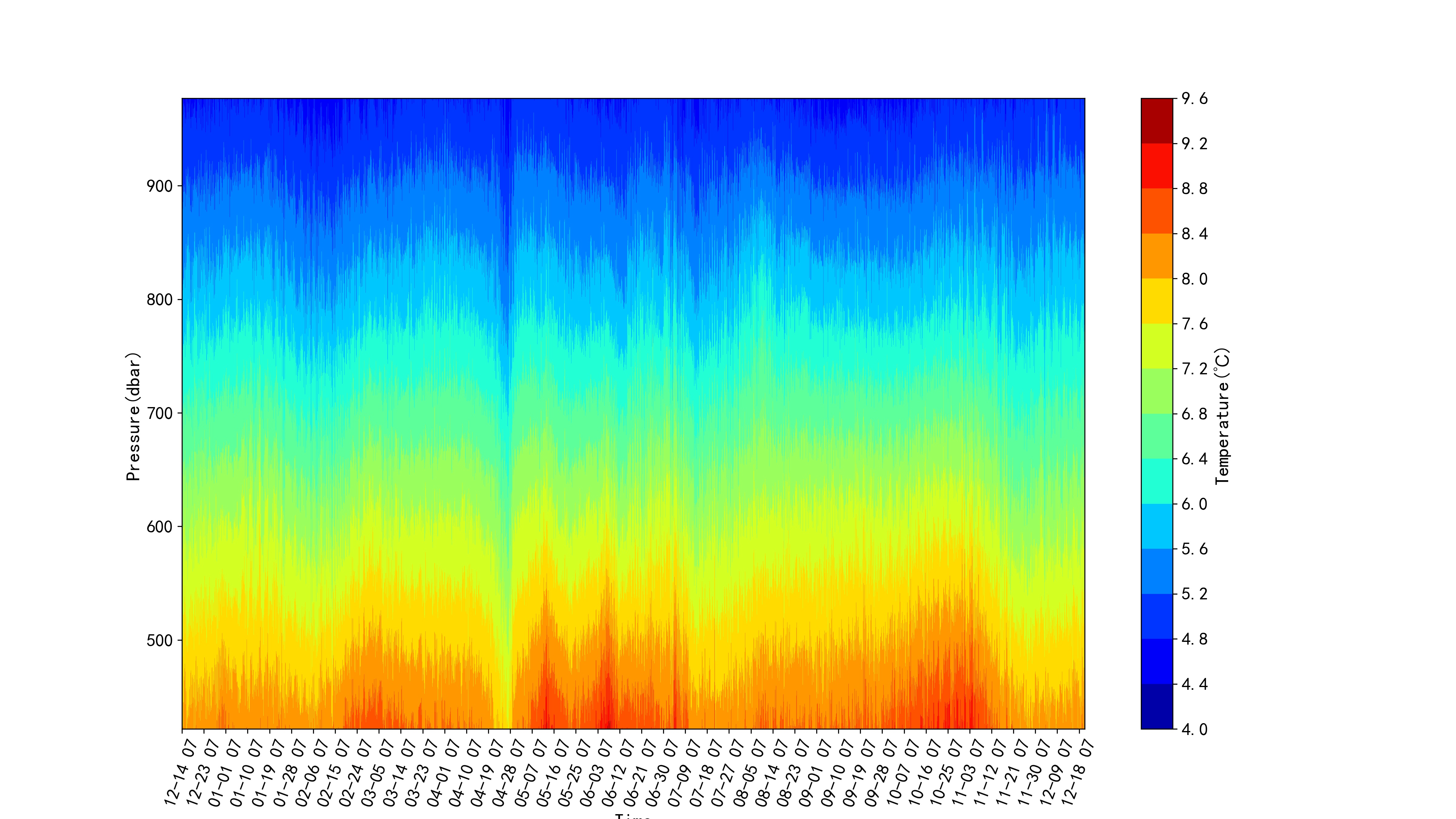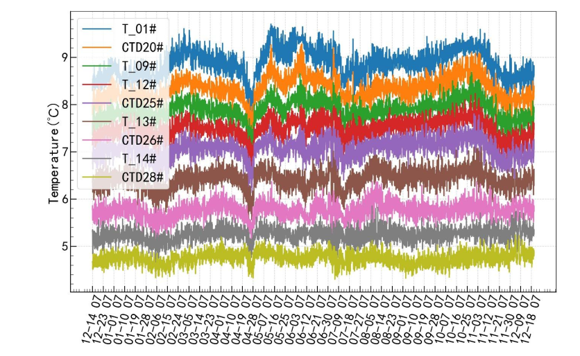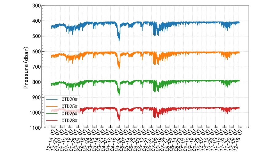 從布放至2019年12月20日回收,整套感應耦合傳輸溫鹽深鏈共計有效在位運行371天,多臺套傳感器共計無故障工作時間超80000小時,獲取數(shù)據(jù)8899組,數(shù)據(jù)傳輸成功率達到100%。通過岸站接受到的數(shù)據(jù)進行分析,在2018年4月28日左右,2019年7月9日至2018年7月27日期間,溫鹽深鏈捕捉到了兩次非常明顯的慣性振蕩。