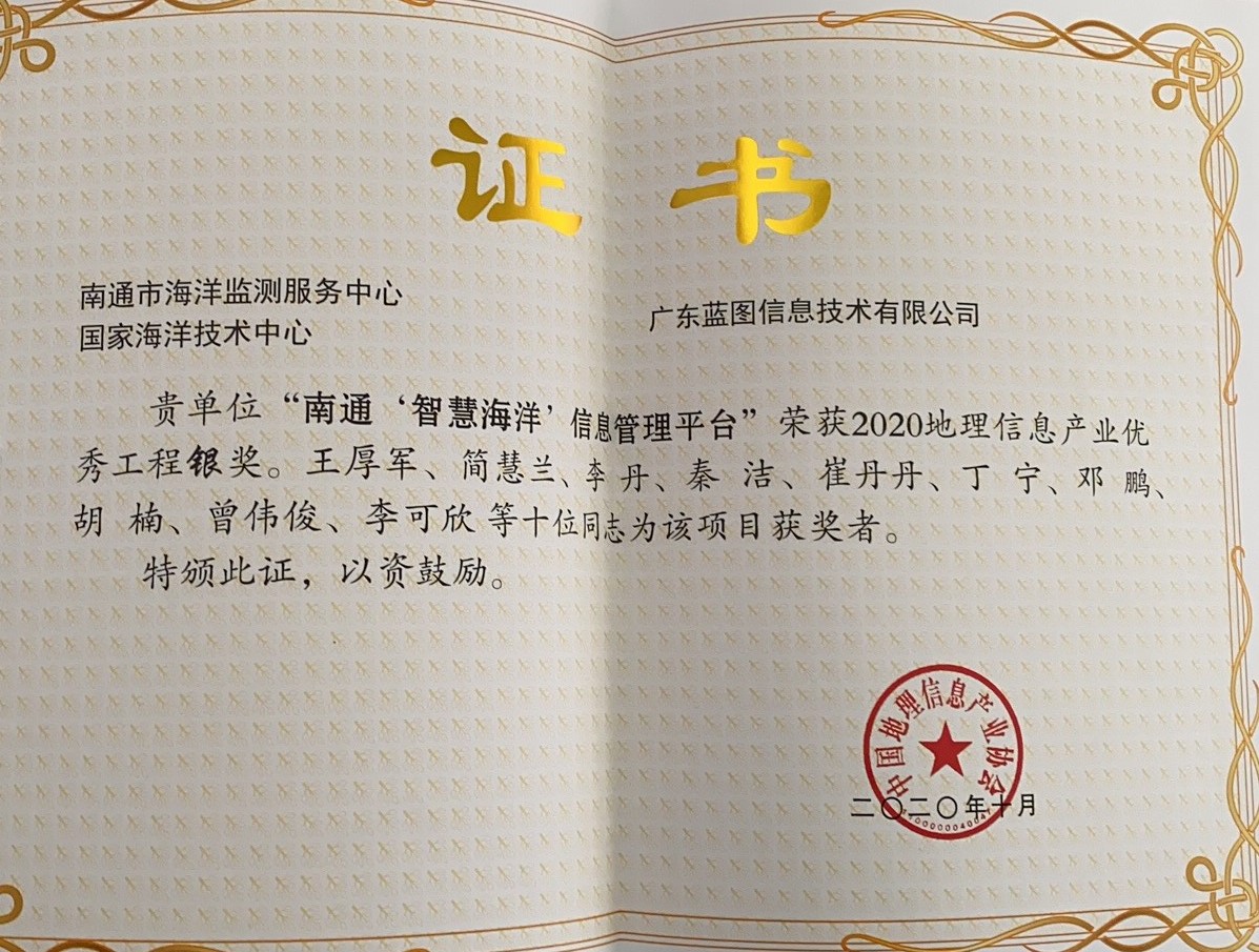 業(yè)務工作10月23日-24日,2020中國地理信息產(chǎn)業(yè)大會在南寧召開。大會表彰了2020地理信息產(chǎn)業(yè)優(yōu)秀工程獎,該獎項由國家測繪地理信息局、科學技術部批準設立。我中心作為第一完成單位的“南通‘智慧海洋’信息管理平臺”項目獲得2020地理信息產(chǎn)業(yè)優(yōu)秀工程銀獎。