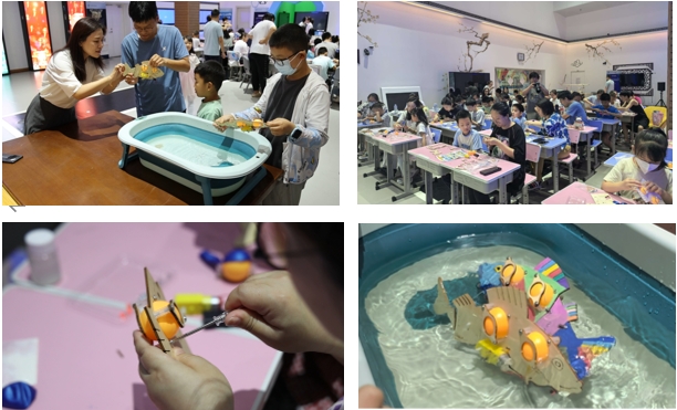 最受歡迎的環(huán)節(jié)當(dāng)屬“我的機(jī)器魚(yú)DIY”。在老師們的指導(dǎo)下,孩子們用環(huán)保材料組裝仿生機(jī)器魚(yú)模型,不僅了解了浮力與動(dòng)力的科學(xué)原理,更在創(chuàng)作中注入對(duì)海洋生物的關(guān)愛(ài)。傳統(tǒng)海洋監(jiān)測(cè)儀器在定點(diǎn)監(jiān)測(cè)中存在固有局限,觀測(cè)范圍常因布放環(huán)境制約而受限,難以對(duì)復(fù)雜海域?qū)崿F(xiàn)靈活、全面的覆蓋。而在課堂上,一群充滿好奇心的孩子們正以創(chuàng)新視角打破這一局限——他們以機(jī)器魚(yú)為靈動(dòng)的探索載體,展開(kāi)天馬行空的思維碰撞,結(jié)合課堂所學(xué)的海洋監(jiān)測(cè)知識(shí),構(gòu)思出可搭載的多樣化智能監(jiān)測(cè)設(shè)備,共同暢想借助仿生機(jī)器魚(yú)穿梭于波濤之間,解鎖奇妙海洋世界的無(wú)限奧秘。